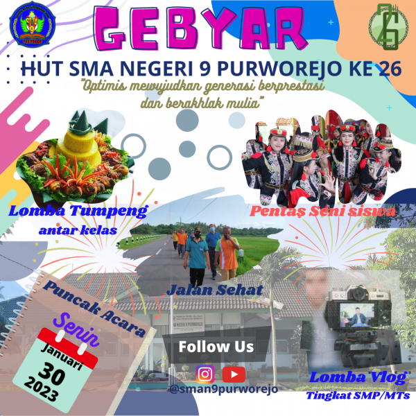 Gebyar HUT ke 26 SMA Negeri 9 Purworejo berlangsung meriah pada senin, 30 Januari 2023. Berbagai kegiatan diikuti oleh seluruh warga sekolah. Peda kesempatan ini juga disampaikan pengumuman lomba vlog tingkat SMP/MTs di wilayah Kabupaten Purworejo. Dari dua belas peserta, juara 1 ialah Nafisah Larasati Nur’aini siswi SMP N 8 Purworejo, juara 2 Ayuni Putri Rahayu siswi SMP N 3 Purworejo dan juara 3 Teguh Natrianto siswa SMP N 8 Purworejo. Masing-masing peserta berhak mendapatkan hadiah berupa uang tunai, piala dan sertifikat. Pemberian hadiah diberikan langsung oleh kepala SMA Negeri 9 Purworejo Bapak Drs.Arif Arvianta Achmad, M.Pd.